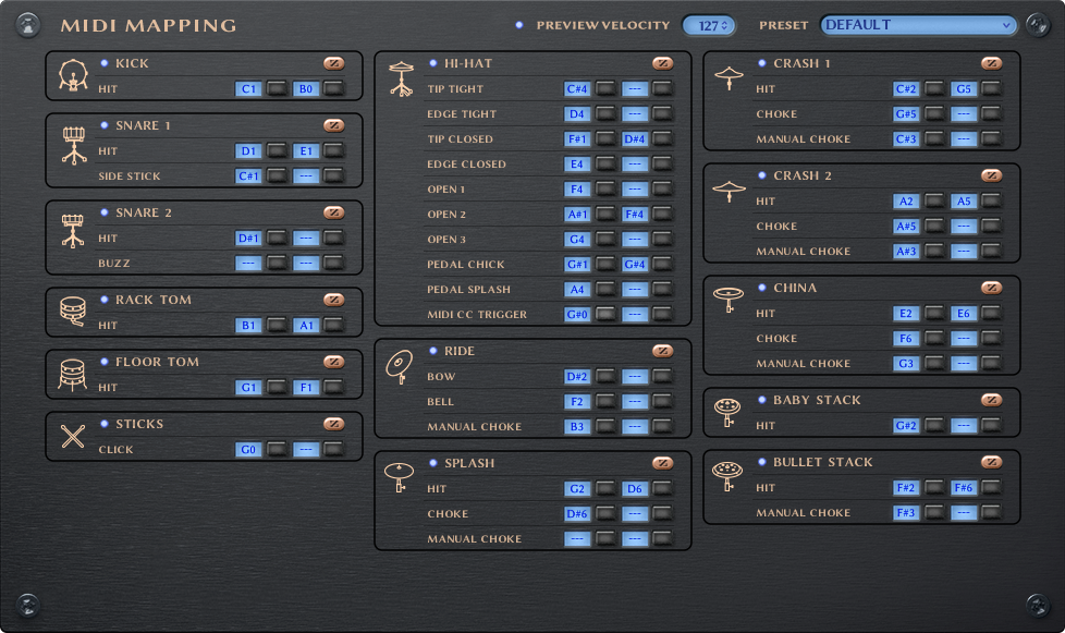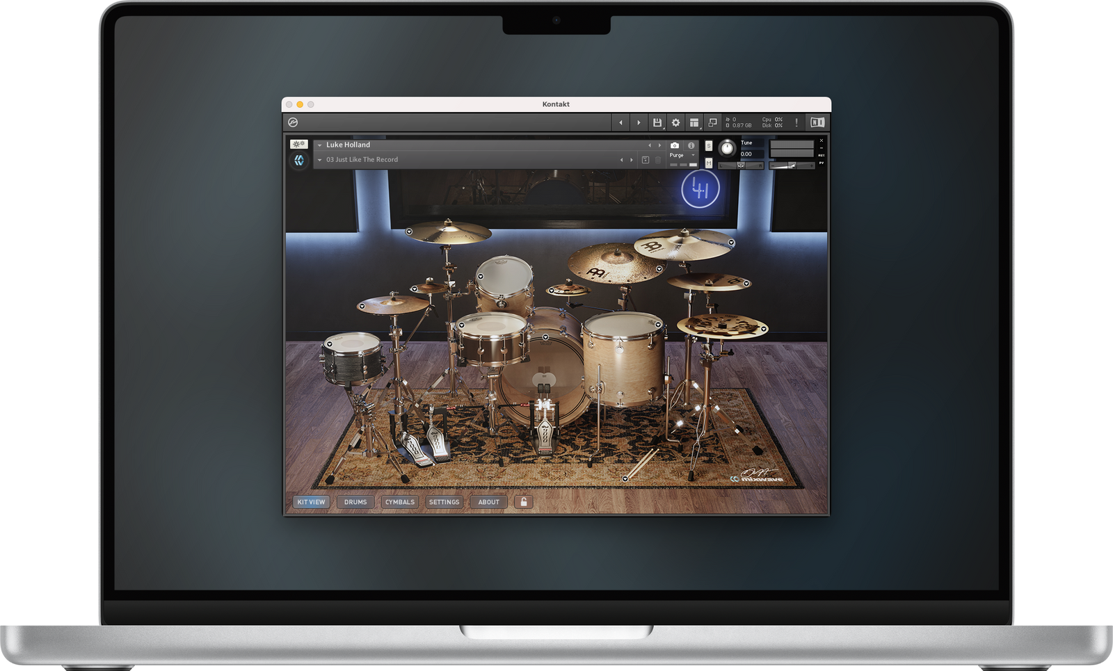 A 5 piece kit including 3 snares and 8 cymbals featuring Luke Holland's signature Meinl Baby Stack and Bullet Stack all sampled and mixed at MixWave Studios.