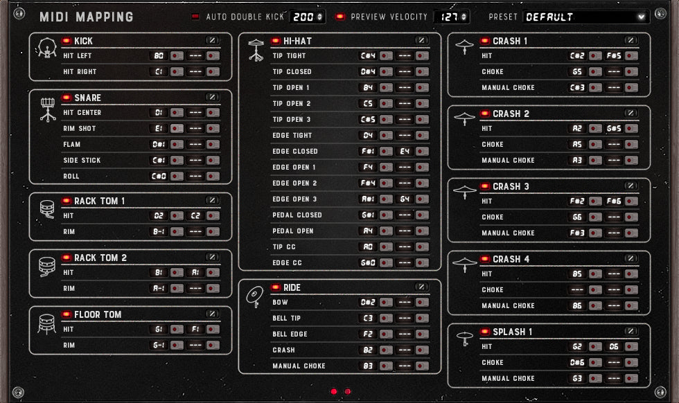 Designed to elevate your creativity in any workflow. Effortlessly customize the MIDI mapping, or dial in your exact touch response with adjustable velocity curves. Activate Auto Double Kick to automatically alternate between left and right sampled kick hits, delivering a more realistic performance.